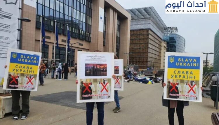 وحمل المتظاهرون في بروكسل لافتات تندد بغزو موسكو لكييف وما تحظى به موسكو من دعم أنظمة استبدادية أبرزها الإمارات.
