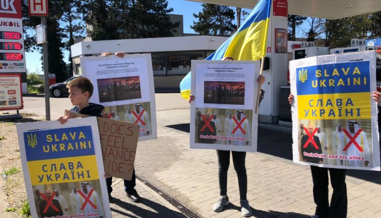 وجاء على لافتة بارزة (المجد لأوكرانيا واللعنة على بوتين وحلفائه)، وثانية عبارة (الإمارات توفر ملجأ للروس من العقوبات الأوربية).