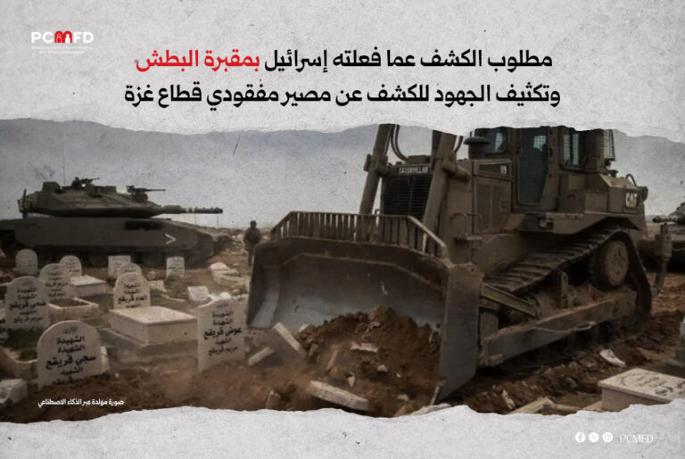 وعبر المركز في بيان له عن قلقه، من الإجراءات التي رافقت انتشال الجيش الإسرائيلي جثمان آخر أسراه من مقبرة البطش قبل عدة أيام، والتي تخللها نبش أكثر من 700 قبر لفلسطينيين، دون توفر أي معلومات مستقلة حول ما إذا كان رافق ذلك سلب للجثامين الفلسطينية أو نقلها إلى مواقع أخرى، لا سيما في ضوء النمط الموثّق لإسرائيل في استهداف المقابر في غزة عبر التدمير والتجريف والعبث بالرفات وسلب الجثامين.