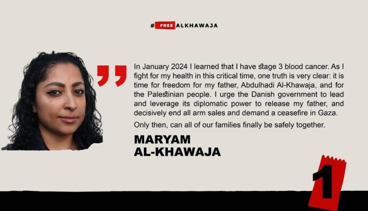 في الفيديو، صرحت الخواجة قائلة: “في يناير/كانون الثاني 2024، تلقيت خبر إصابتي بسرطان الدم في المرحلة الثالثة. وفي هذا الوقت الحرج، هناك حقيقة واضحة للغاية، وهي أن الحرية أصبحت ضرورة. أنا أدعو لحرية والدي عبد الهادي الخواجة، وأيضًا لحرية الشعب الفلسطيني. أناشد الحكومة الدانماركية أن تكون قائدة في مجال حقوق الإنسان، وأن تستخدم نفوذها الدبلوماسي للضغط من أجل إطلاق سراح والدي ووقف بيع الأسلحة بشكل كامل، وأن تدعو لوقف إطلاق النار في غزة. فقط حينها، سيتمكن أفراد عائلتنا من العيش بأمان وسلام.”
